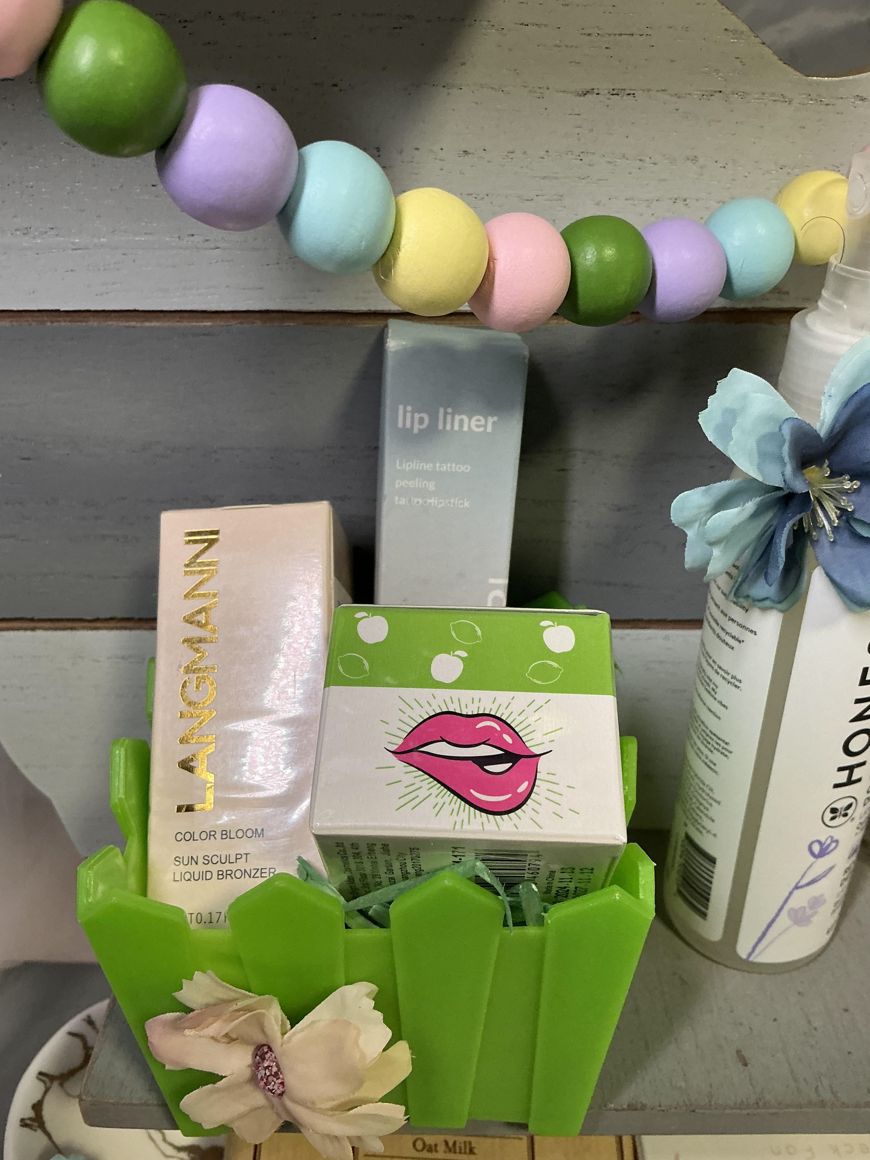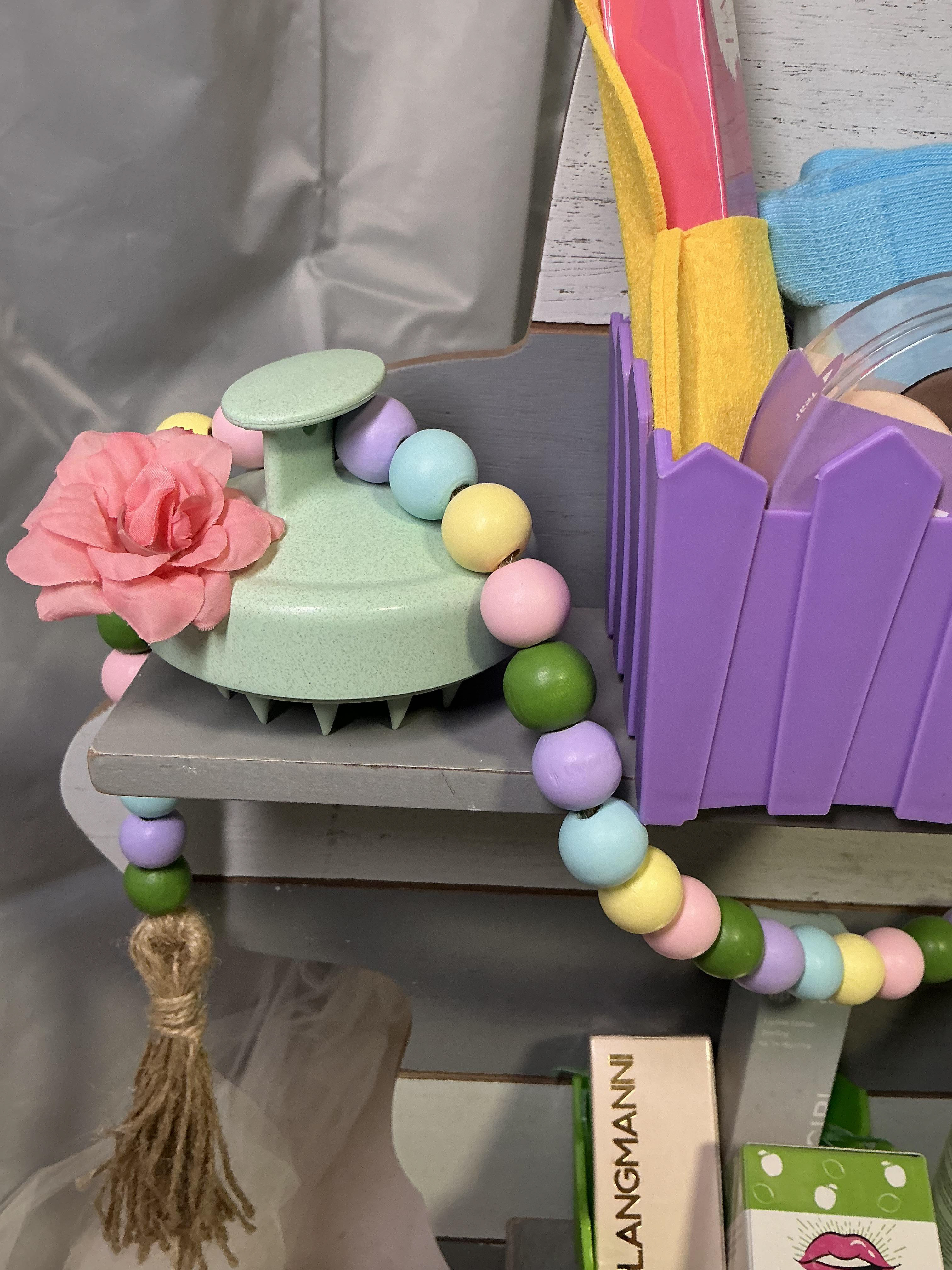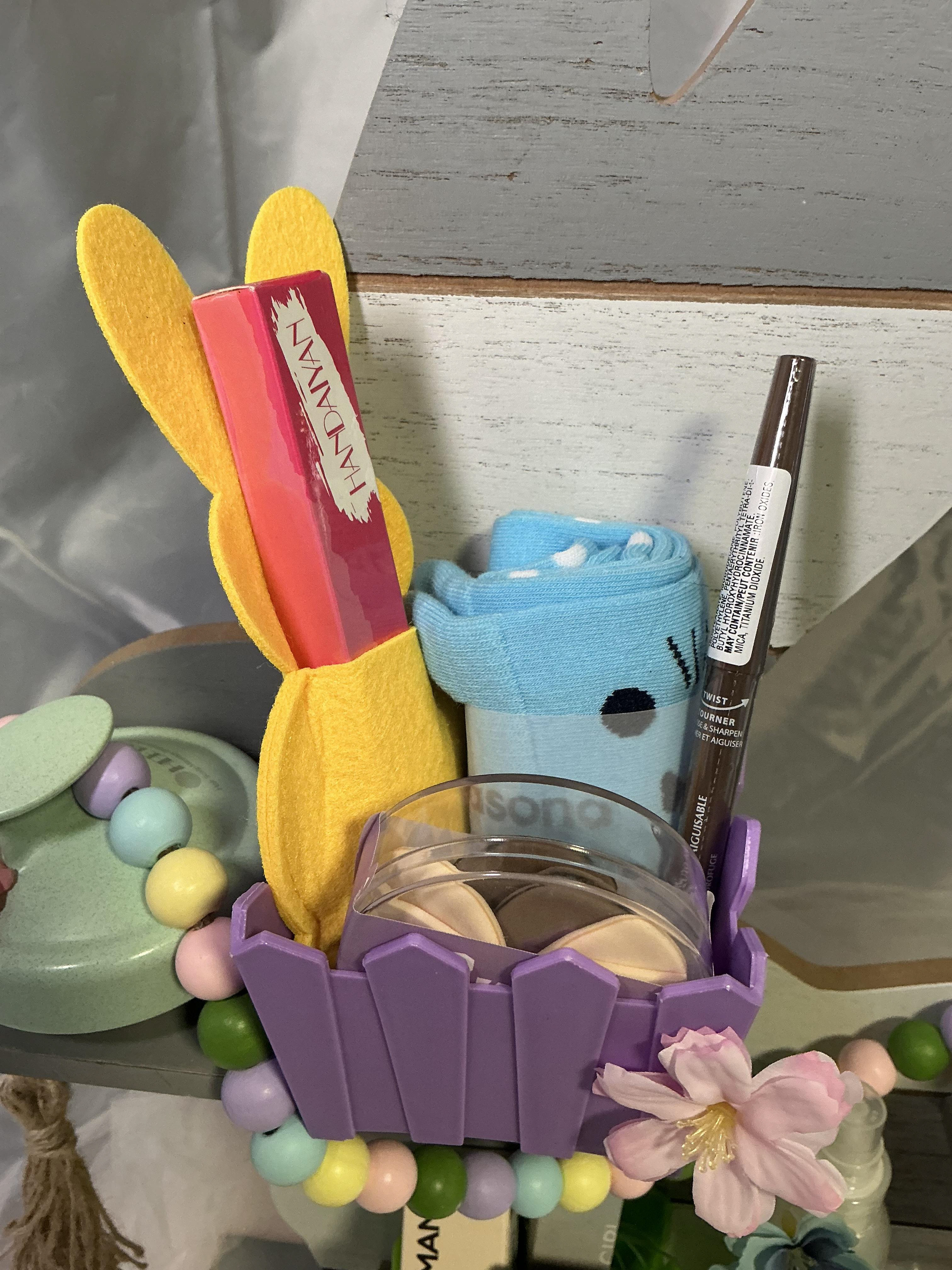 This one’s not your typical gift basket — it’s a full Easter display that doubles as a functional beauty station. Built on a reusable wooden bunny shelf, this piece is designed to be both a standout gift and something they’ll keep long after the products are gone.