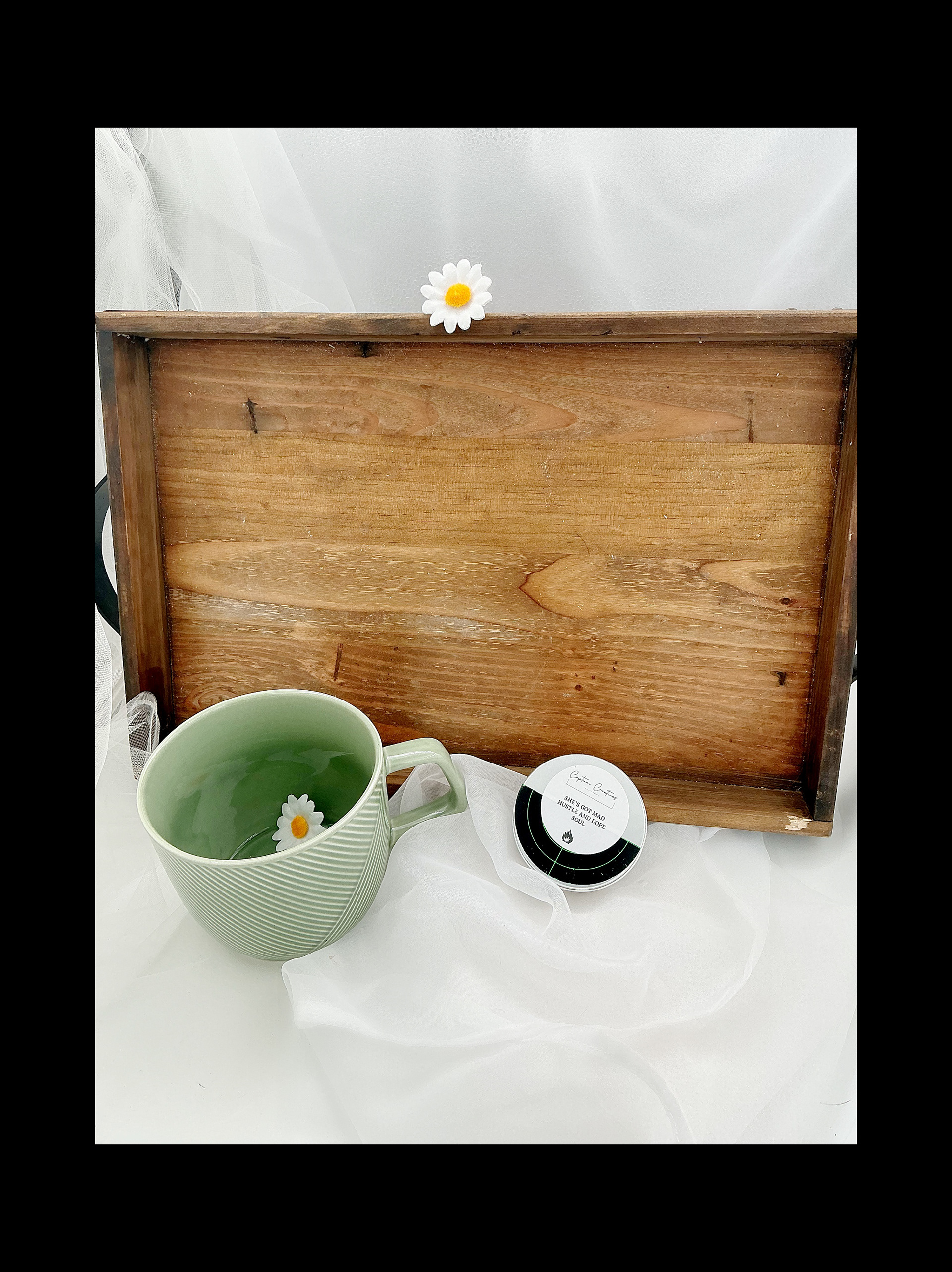 Substantial wood tray that anchors the entire collection and doubles as décor.