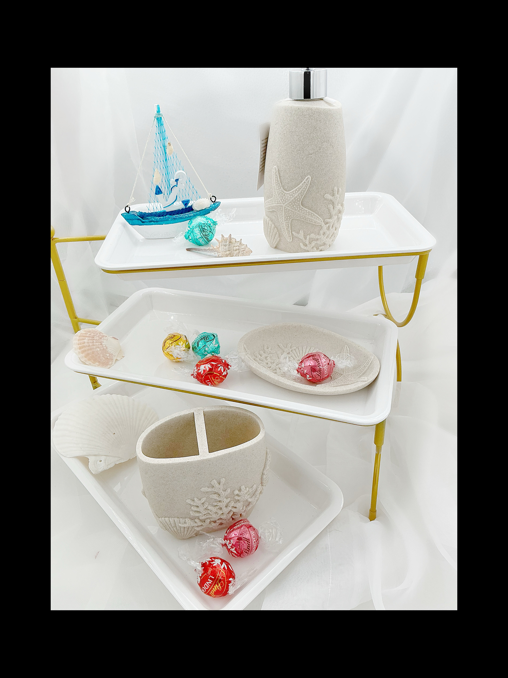 Stone-Style Bathroom Set (3-Piece) β Matching soap dispenser, toothbrush cup, and soap dish with shell and coral detailing for a cohesive coastal look.