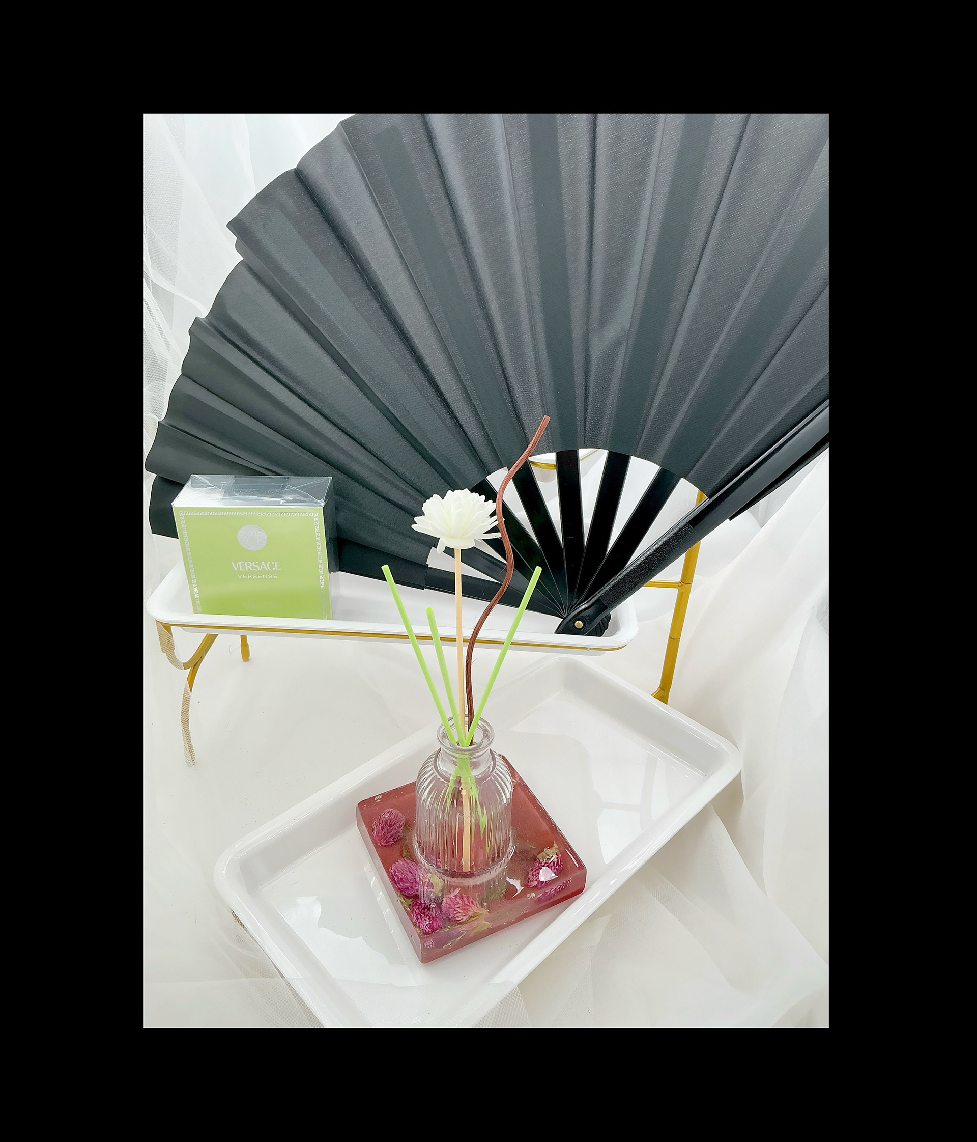 Modern glass diffuser vessel with reeds for display or customizable fragrance use.