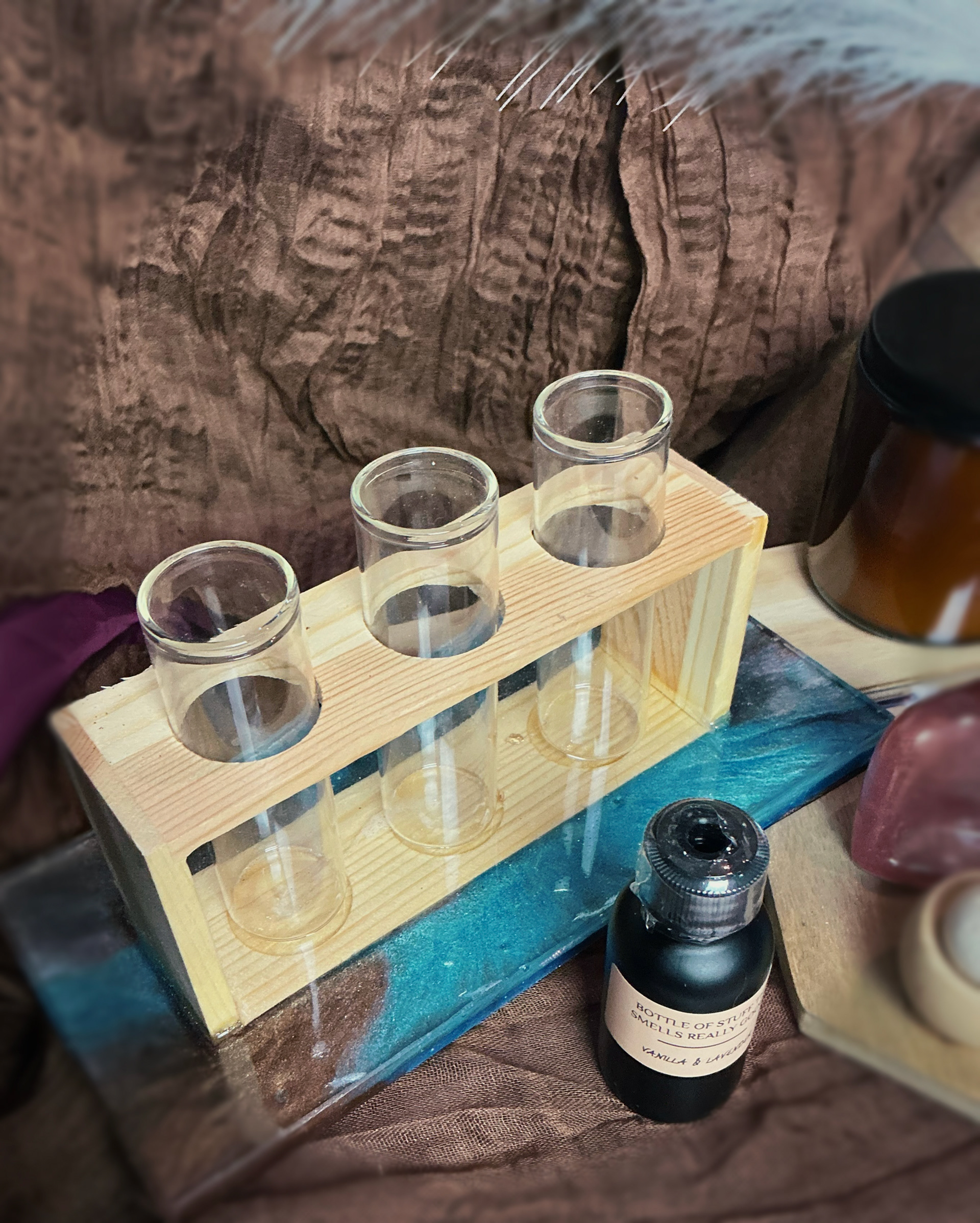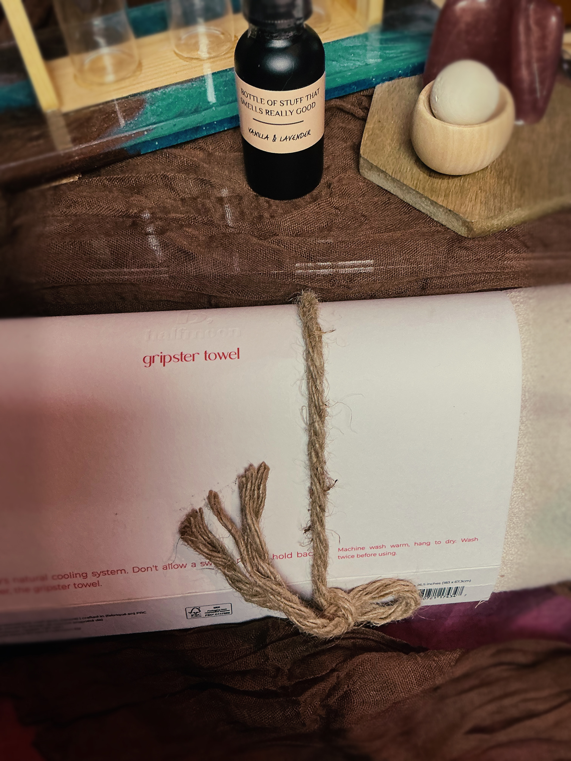 Wooden display tray and brown gauze table runner (used as styled packaging)